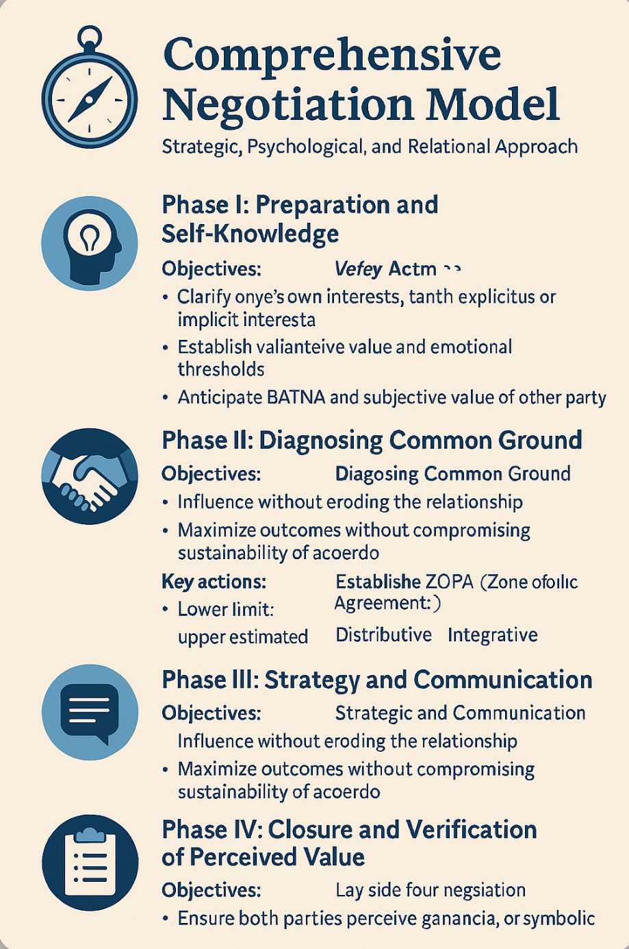 Negotiation is not merely an exchange of interests—it is a dynamic architecture of meanings, perceptions, and relationships. In interpersonal, corporate, or geopolitical contexts, negotiating requires navigating between rationality and emotion, power and empathy, the explicit and the symbolic. This model offers an integral framework that weaves together internal preparation, relational diagnosis, strategic communication, and value verification—aimed not only at reaching agreements, but at cultivating sustainable and conscious relationships.