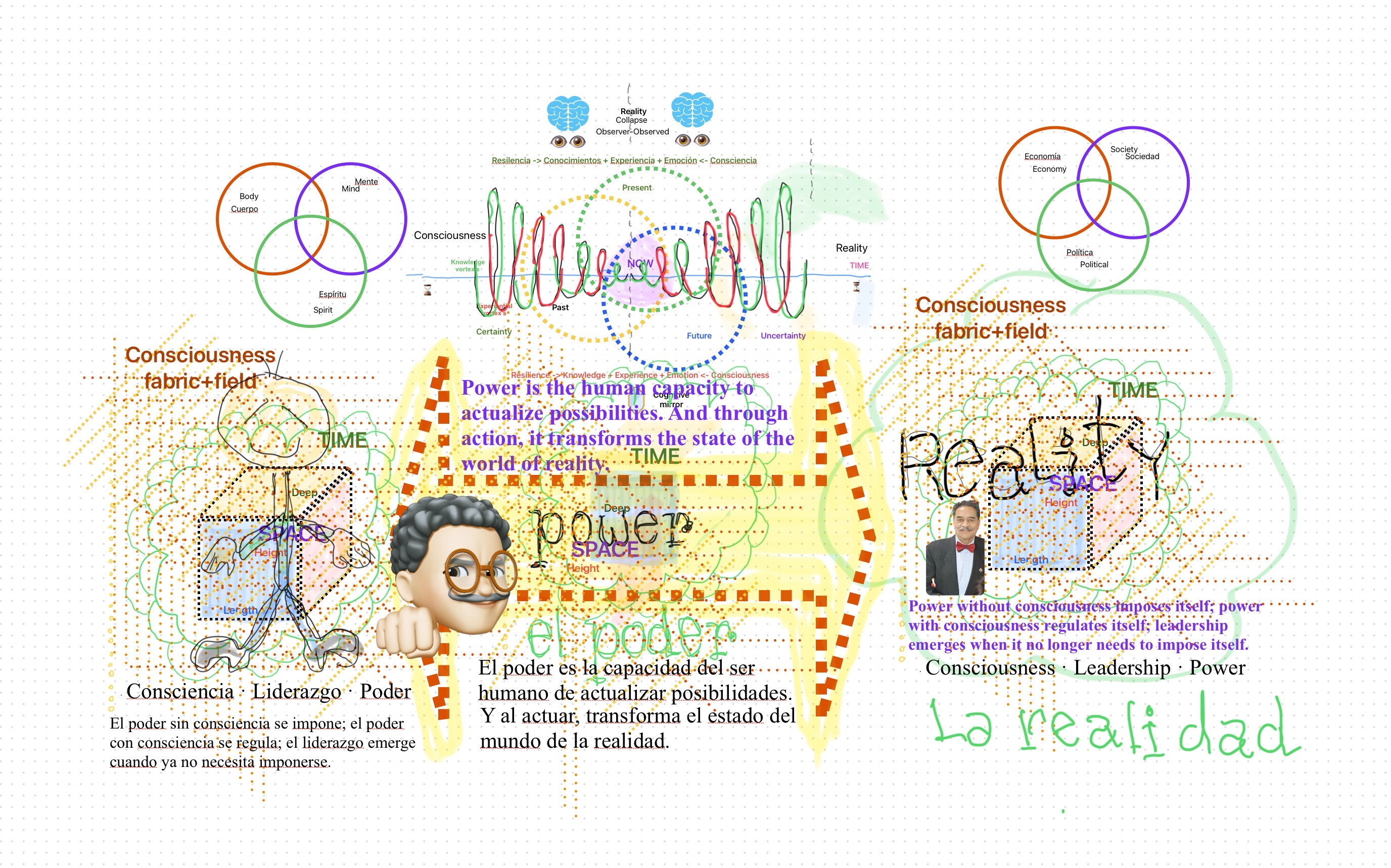 El poder emerge de la interacción dinámica entre estas seis dimensiones. No existe poder puramente económico, social o político sin su correlato en las capacidades individuales; tampoco existe poder puramente intelectual, corporal o espiritual sin su inserción en estructuras colectivas.
